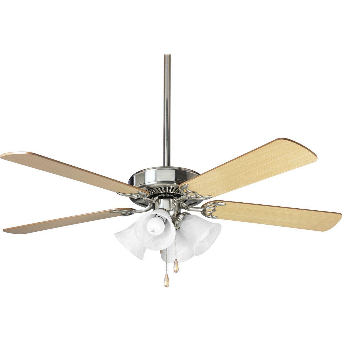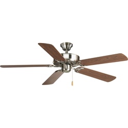 Progress Lighting® AirPro™ Ceiling Fan, Pre-Wired Transitional, Series: P2501, Light Kit: Yes, 12 deg Blade Pitch, 4406 cfm Flow Rate, 160 rpm Speed, 62 W Power, 120 VAC, 3 Speed, 5 Blades, 84 cfm/W Air Flow Efficiency, Pull Chain Control, Reversible Blade, Fiberboard/MDF Blade, Manual Reverse Control/Triple Capacitor Speed Control Motor, Standard Canopy, 3/4 in OD x 4-1/4 in L Down Rod, Steel Housing Material, 13-1/2 in Overall Height, 12 in Blade to Ceiling Height, Import