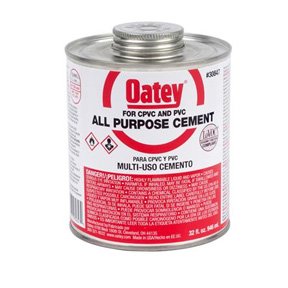 Oatey® Solvent Cement, All Purpose Medium Body, 16 oz Container, For Use With: Upto 12 in Dia ABS, PVC, CPVC Pipe and Fittings, Milky Clear, Solvent Odor/Scent, Composition: Furan, Tetrahydro, Acetone, Cyclohexanone, Methyl Ethyl Ketone, Polyvinyl Chloride, Ethene, Chloro-Homopolymer, Chlorinated, Silica, Amorphous, Fumed, 5 to 6 min Setting, 2 hr Curing, 40 to 110 deg F