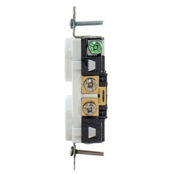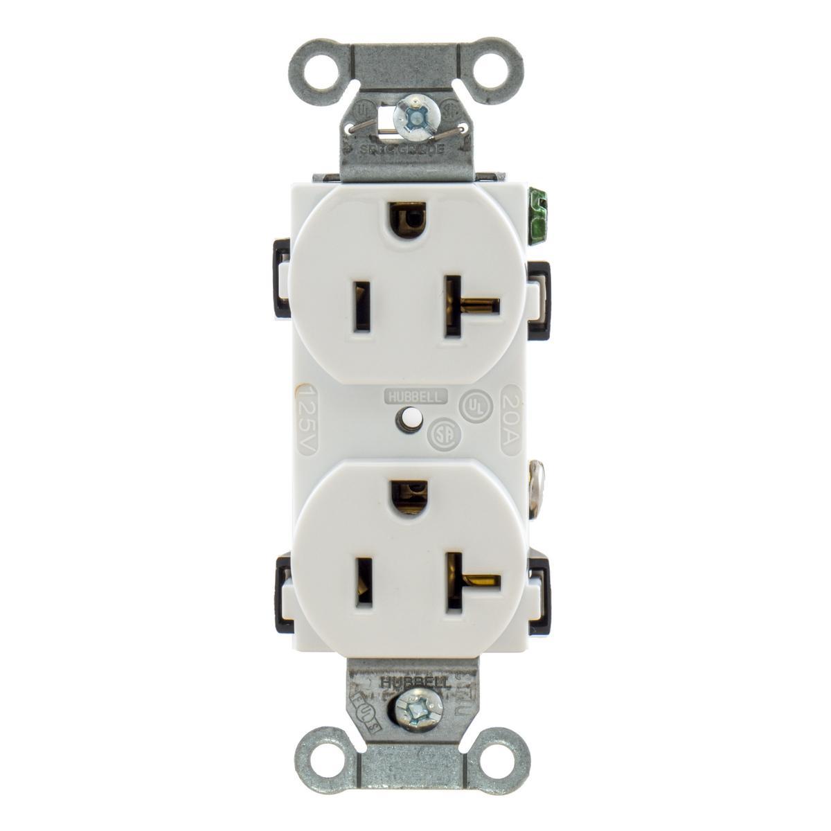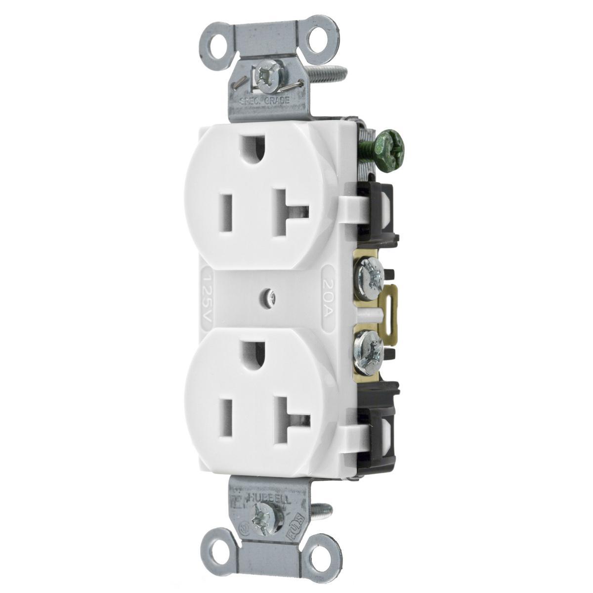 Wiring Device-Kellems Straight Blade Receptacle, Duplex Self-Grounding, 125 VAC, 20 A, 1 hp, 2 Pole, 3 Wires, NEMA 5-20R NEMA Rating, Commercial/Specification Grade, -40 to 75 deg C, Back/Side Wire Terminal, Composite/Thermoplastic, White, 3.281 in H x 1.322 in W x 1.067 in D Dimensions