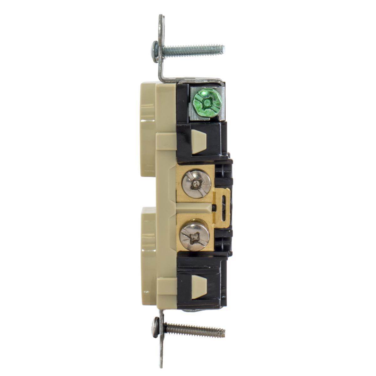 Wiring Device-Kellems Straight Blade Receptacle, Duplex Self-Grounding Standard Traditional, 125 VAC, 20 A, 1 hp, 2 Pole, 3 Wires, NEMA 5-20R NEMA Rating, Commercial/Specification Grade, -40 to 75 deg C, Back/Side Wire Terminal, Composite/Thermoplastic, Ivory, 1.32 in L x 0.83 in W x 3.28 in H Dimensions