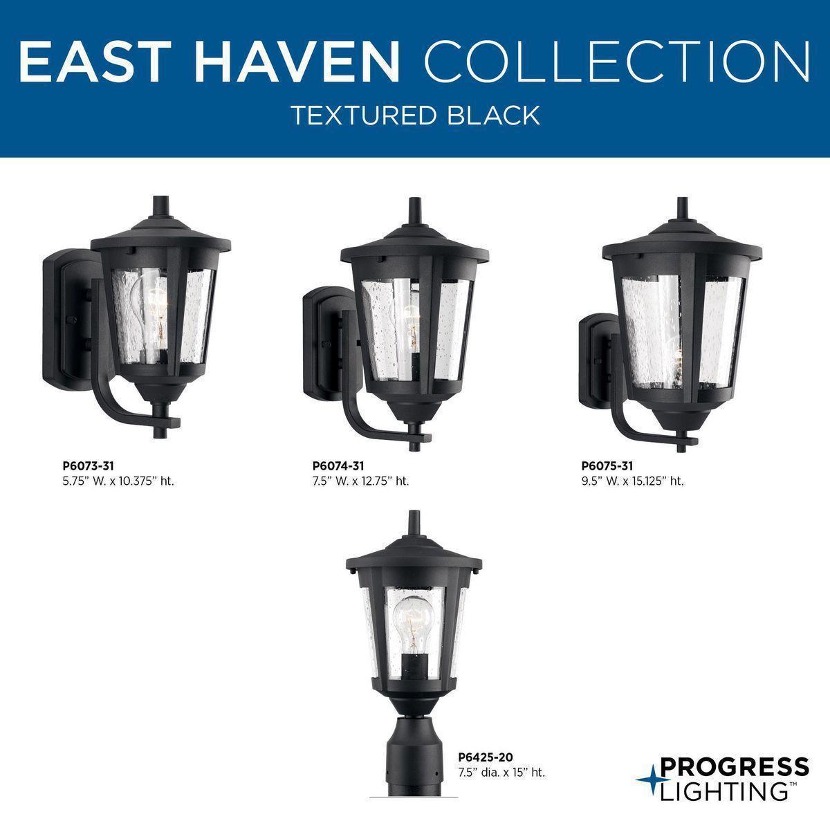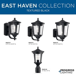 East Haven offers contemporary styling to complement a variety of home styles. Small wall lantern with clear seeded glass.