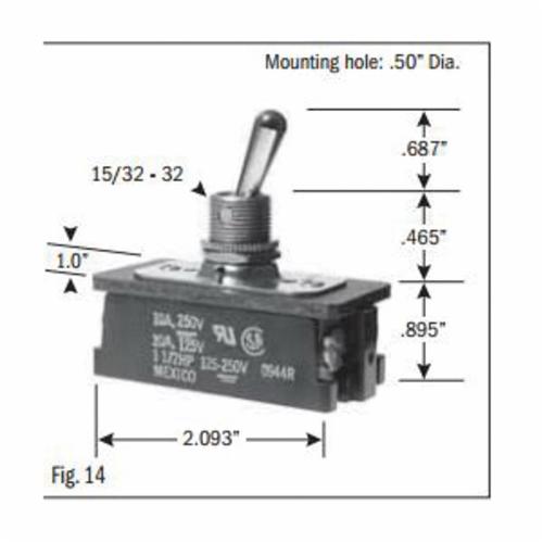 SELECTA® Toggle Switch, Heavy Duty, 125/250 VAC, 20/10 A, 1-1/2 hp, DPST, 2 Poles, Bat Handle, Threaded, Screw Terminal, 1.98 in L x 1 in W x 2.12 in H