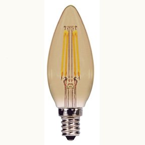 SATCO® LED Lamp, Dimmable, 3.5CTA/LED/AMB/20K/120V Designation, 3.5 W Wattage, 40 W Incandescent Equivalent, 120 VAC, LED Lamp, E12 Candelabra Lamp Base, C11 Torpedo Shape, 300 Lumens, 15000 hr Average Life, 80 CRI, 2200 K Color Temperature, Transparent Amber Lamp, Enclosed Fixture, Omnidirectional Beam, 360 deg Beam, 1-3/8 in Dia x 4-5/16 in L Dimensions