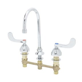 T & S Lavatory Manual Faucet, Concealed Widespread, 2.2 gpm Flow Rate, 8 in Center Distance, Tubular Spout, 5-3/4 in Spout Reach, 6-13/16 in Spout Height, Wrist Blade Lever Handle, 1/2 in Connection, Male NPSM Connection, Spray Pattern: Aerated, 1-1/4 in Maximum Deck Thickness, Deck Mounting, Eterna Compression Cartridge, 10-11/16 in H x 16 in W Dimensions, Forged Brass, Polished Chrome, Domestic