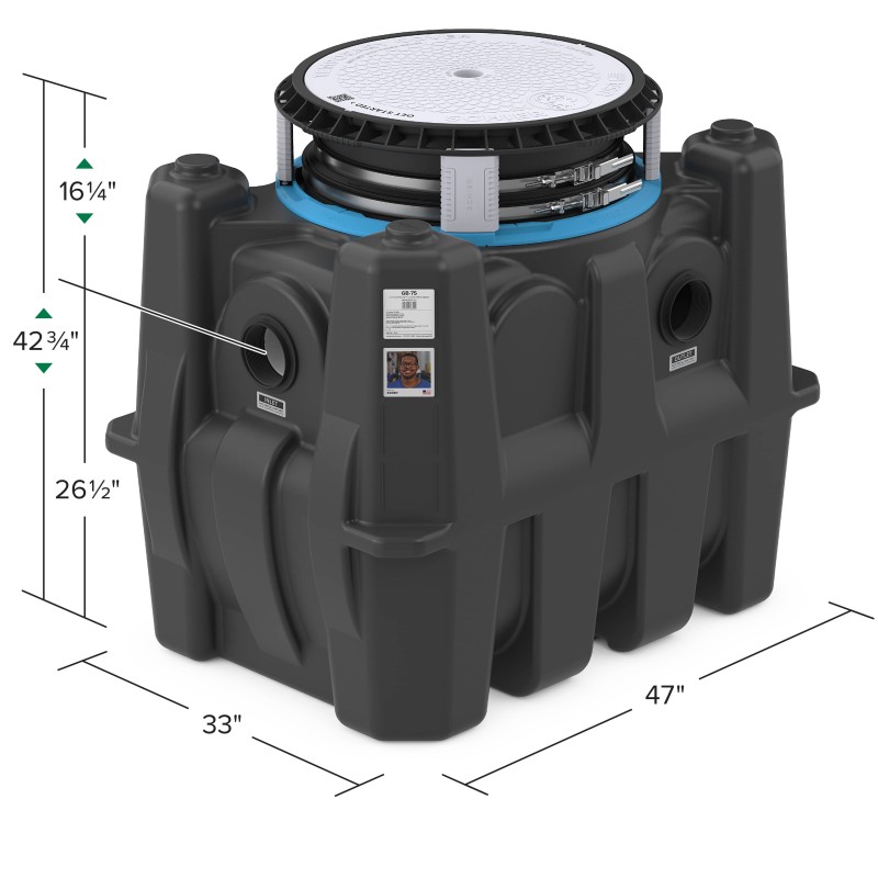 The lifetime guaranteed GB-75 offers best-in-class certified grease capacity and 25% kitchen solids waste capacity. It is rotationally molded from high density polyethylene with deep structural contours to handle any installation scenario: above grade, buried, indoor or outdoor. Use the Fast Pitch (see FP24) riser system to bring covers to finish grade with speed and precision. The triple outlet feature allows for installation flexibility, including the ability to connect an unused outlet for remote pumpout (see PP3).