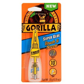 Gorilla Super Glue Brush & Nozzle offers 2 easy ways to dispense for control and accuracy. Brush & Nozzle features a precision tip nozzle and fine bristle brush that allow the user to control their super glue application, making it perfect for any project. Developed for long-lasting repairs in an instant, Gorilla Super Glue dries in 10-45 seconds and is reinforced for increased impact resistance. We call it Impact-Tough because it stands up to wear and tear. In addition to its high-performance formula, we've added an anti-clog cap with a metal pin inside to ensure an airtight seal for maximum reusability. Super glue, also referred to as cyanoacrylate glue, or CA glue, works on a variety of materials, including plastic, metal, fabric, stone, ceramic, paper, rubber and more. It's Gorilla tough, every time.