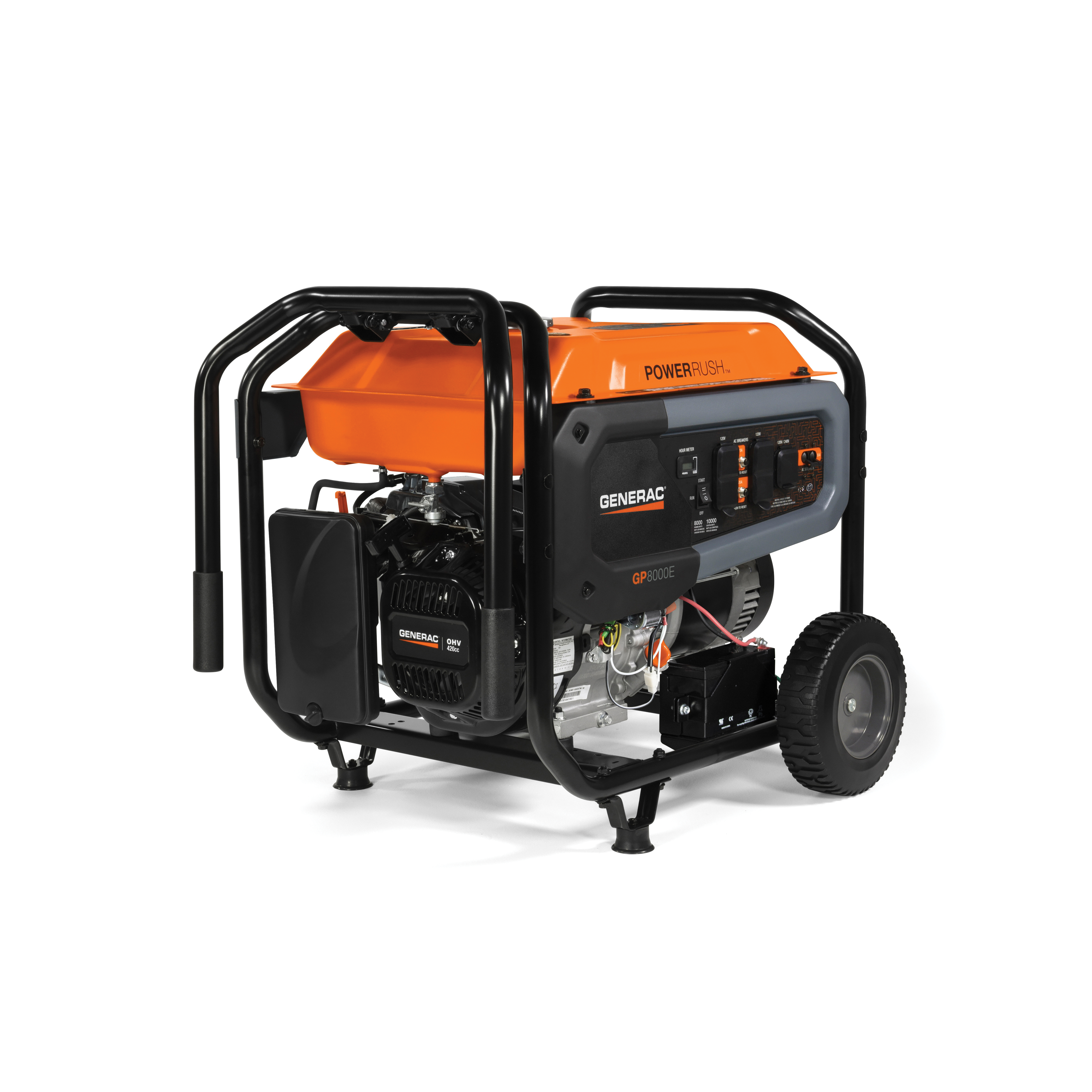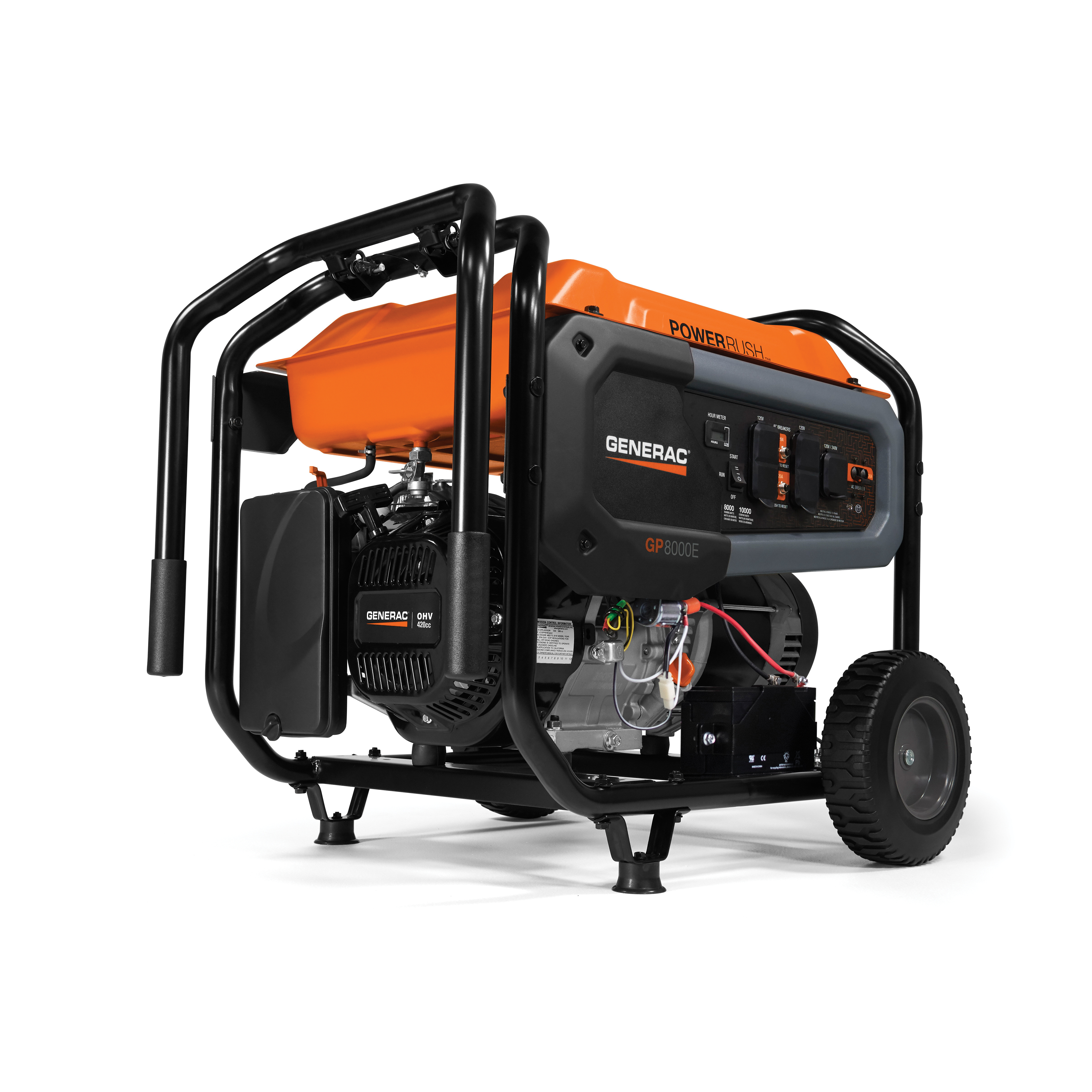 Generac® Portable Generator, Series: GP Series, 120/240 VAC, 66.6/33.3 A, 60 Hz Frequency, 8000/10000 W Power, OHV Engine, Electric Start/Recoil Pull Start Engine Starter, 3600 rpm Speed, Gas Fuel, 7.9 gal Fuel Tank, 11 hr Run