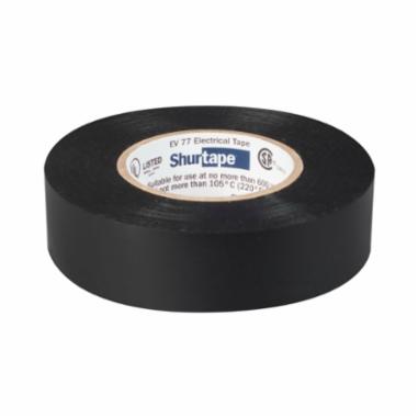 Shurtape® Electrical Tape, Professional-Grade, Series: EV 77B, 66 ft Length, 3/4 in Width, 7 mil Thickness, Black, Non-Corrosive Rubber Based Adhesive, Polymeric PVC Backing, 28 in-oz Adhesion Strength, 600 VAC, 1429 V/mil Dielectric Strength, 20 in-lb Tensile Strength, 220 deg F Maximum Operating