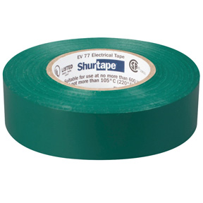 Shurtape® 104701 EV 77C Colored Professional-Grade Electrical Tape, 66 ft L x 3/4 in W, 7 mil THK, Non-Corrosive Rubber Based Adhesive, Polymeric PVC Backing, Green